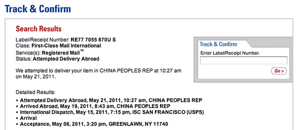 【案例】一從紐約到北京Registered Mail包裹的查詢: