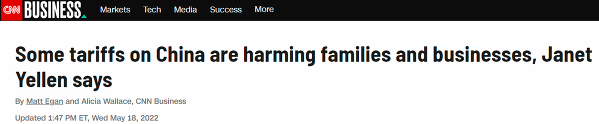 據(jù)美國有線電視新聞網(wǎng)(CNN)5月18日報道,美國財政部長耶倫周三證實,她正向拜登政府主張取消對華部分關(guān)稅,因為這些在美國前總統(tǒng)特朗普時期對中國征收的關(guān)稅“不太具有戰(zhàn)略意義,而且正損害美國消費者和企業(yè)的利益”。